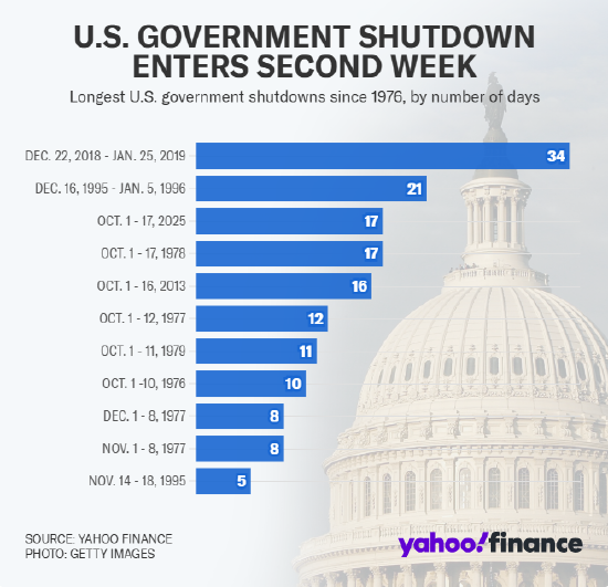 美国政府关门周五进入第17天,目前还看不到结束的迹象。这次政府关门与历史上其他政府关门并列,成为美国联邦政府第三长的关门。